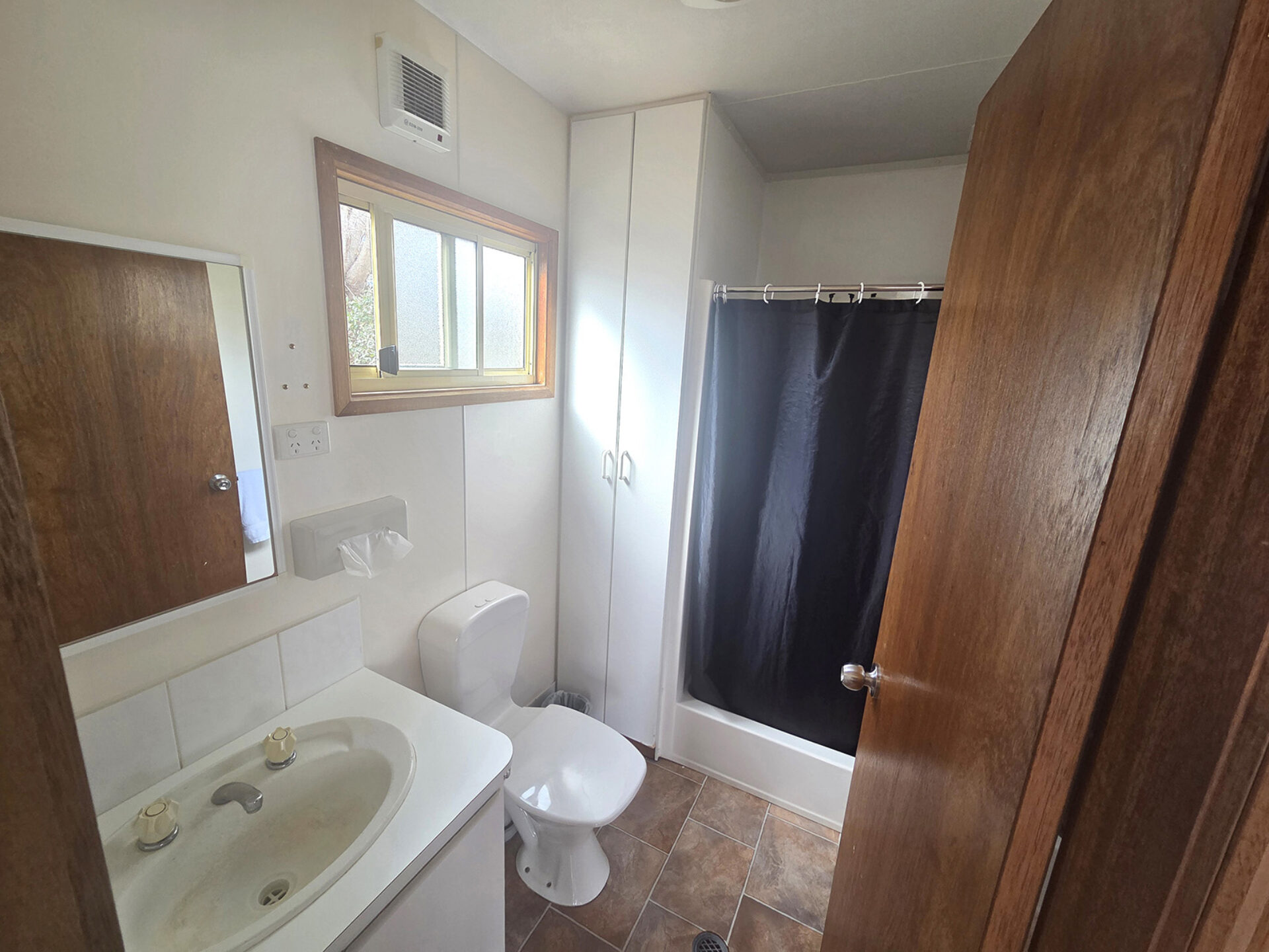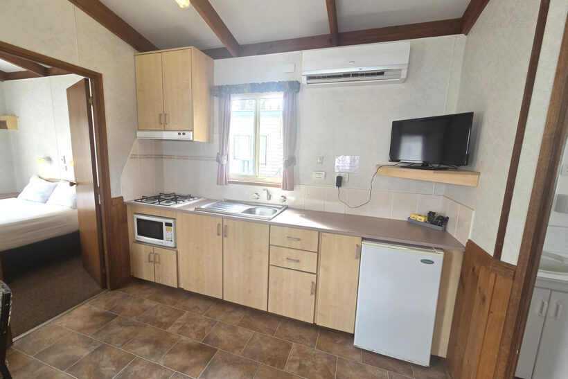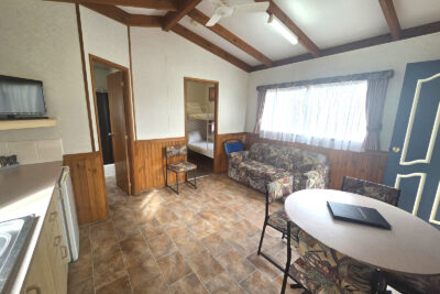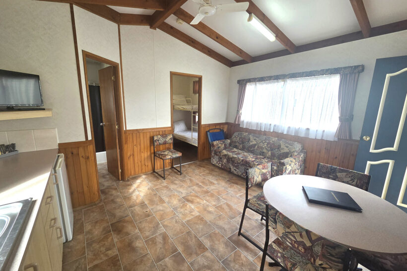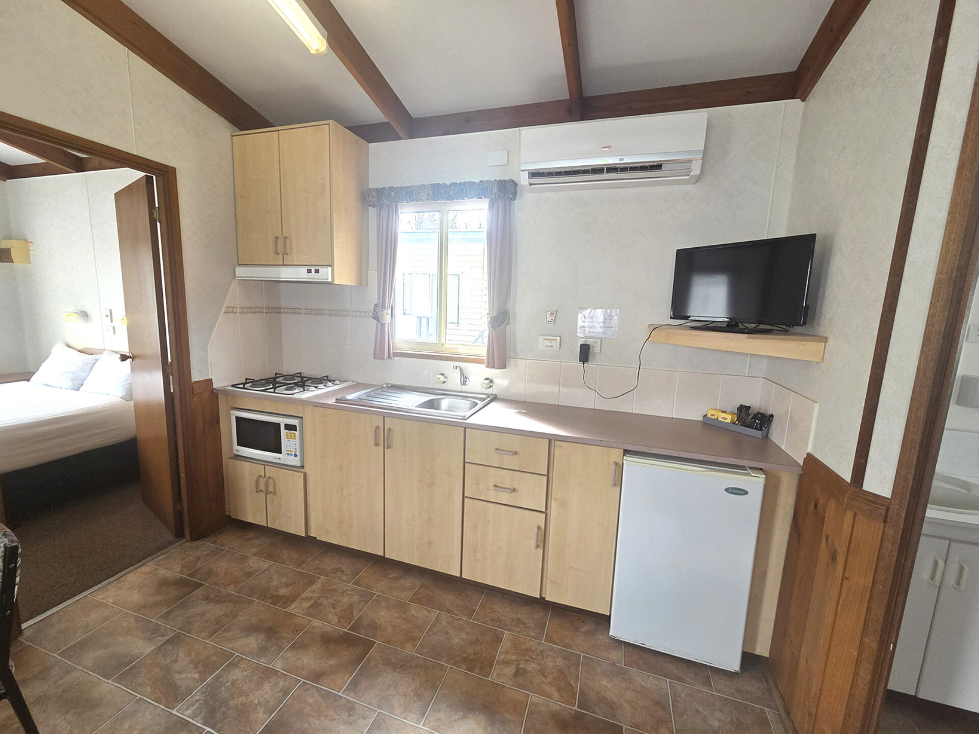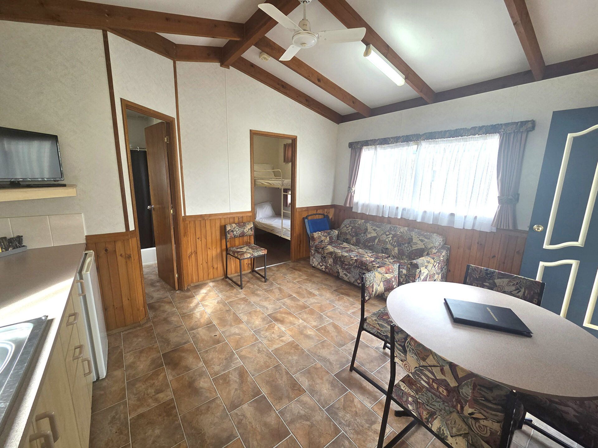 This two-bedroom cabin sleeps up to six guests with a double bed and two sets of bunk beds. The open-plan kitchen and lounge area includes a gas stovetop, microwave, and bar fridge. Reverse cycle air conditioning ensures comfort, and parking is conveniently located right outside. Note: Bunk beds are best suited to children and may not comfortably accommodate adults.