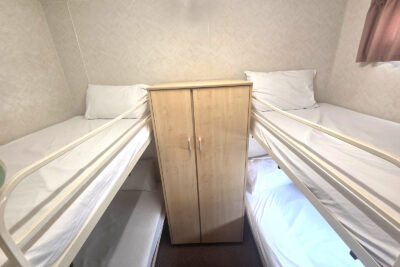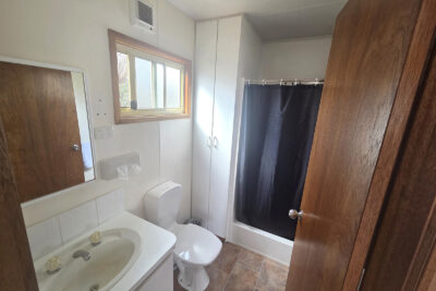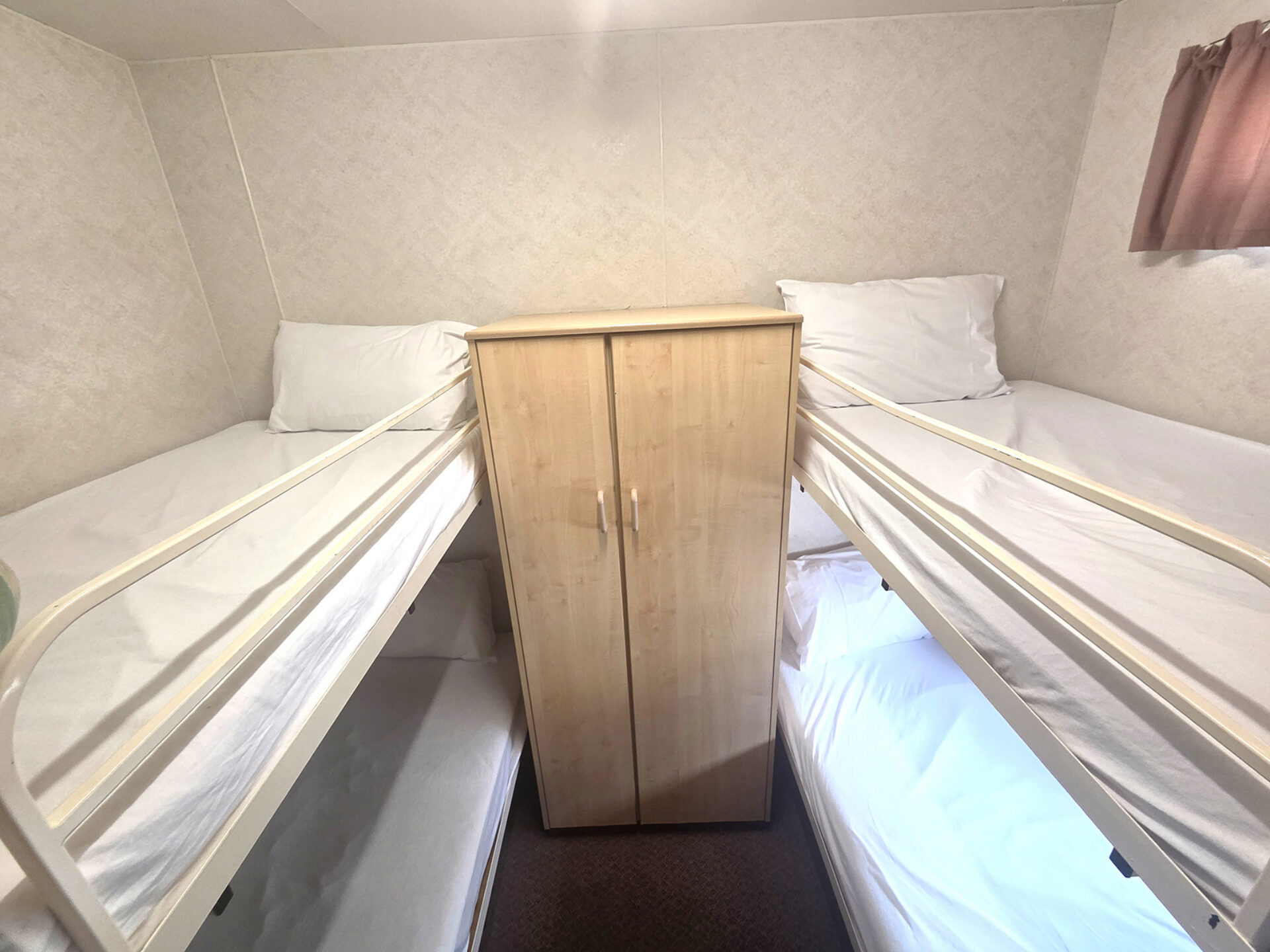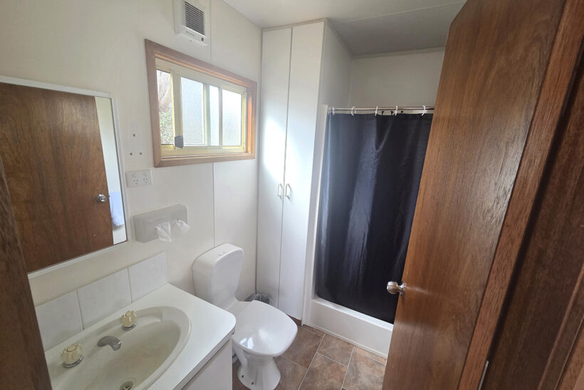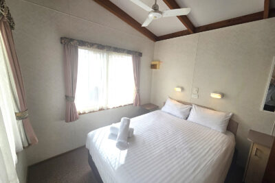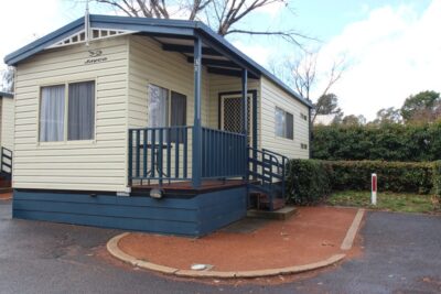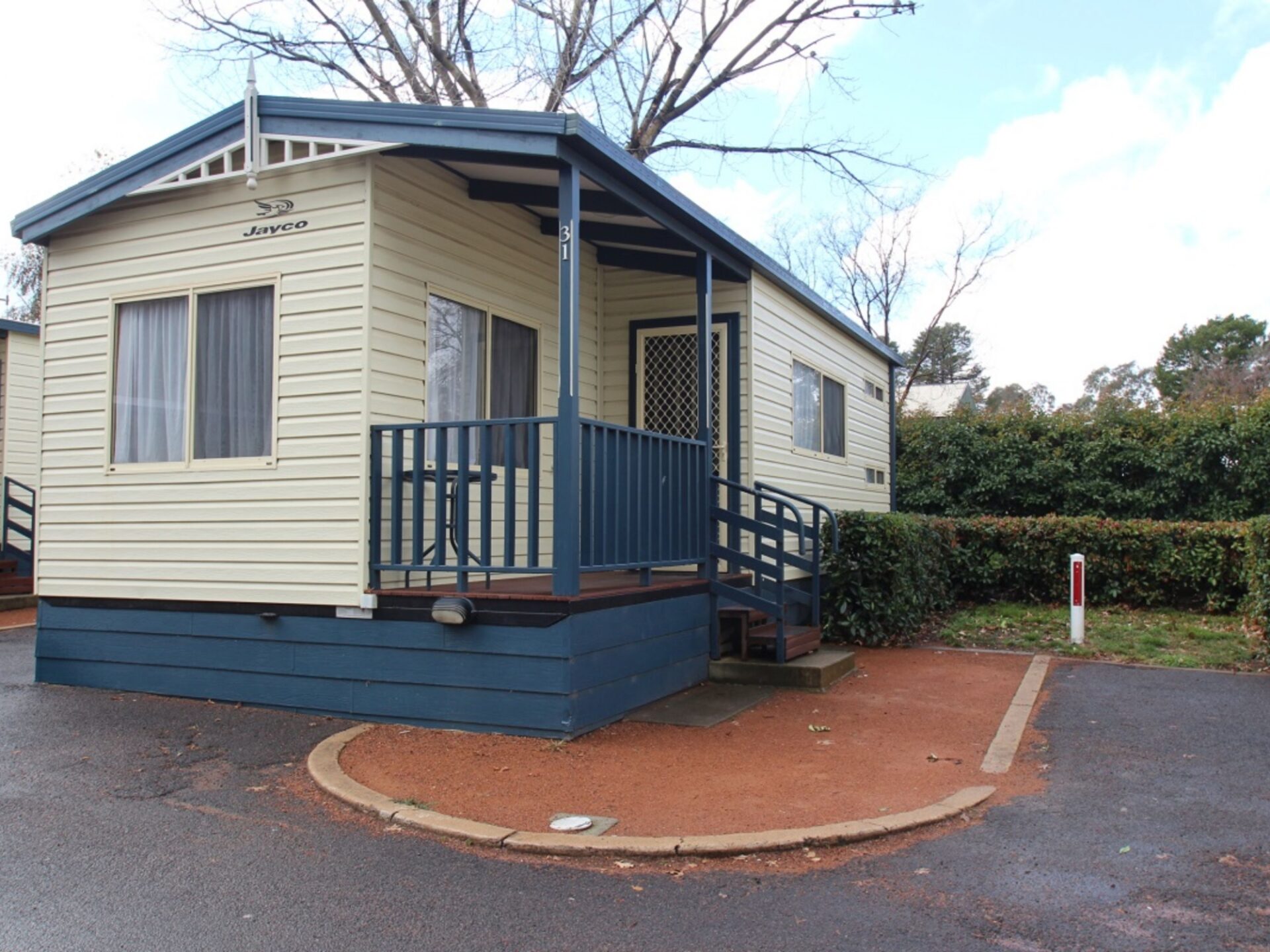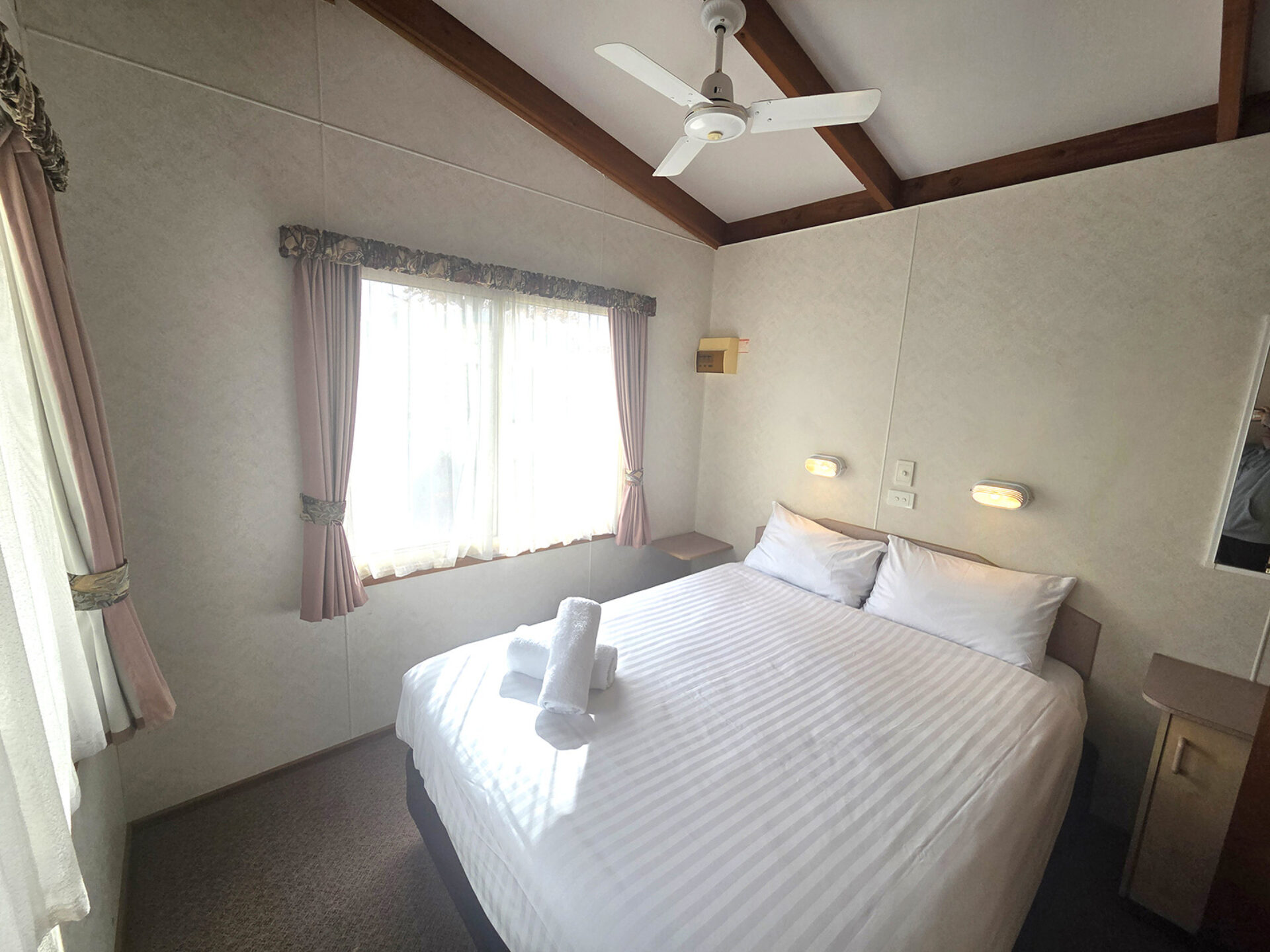 This two-bedroom cabin sleeps up to six guests with a double bed and two sets of bunk beds. The open-plan kitchen and lounge area includes a gas stovetop, microwave, and bar fridge. Reverse cycle air conditioning ensures comfort, and parking is conveniently located right outside. Note: Bunk beds are best suited to children and may not comfortably accommodate adults.