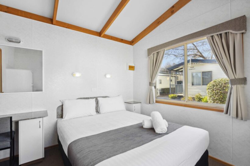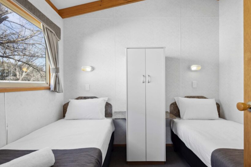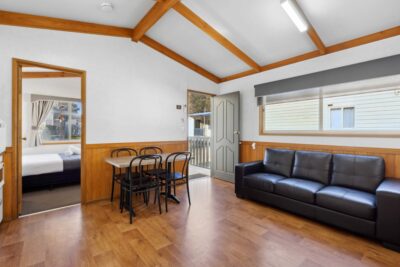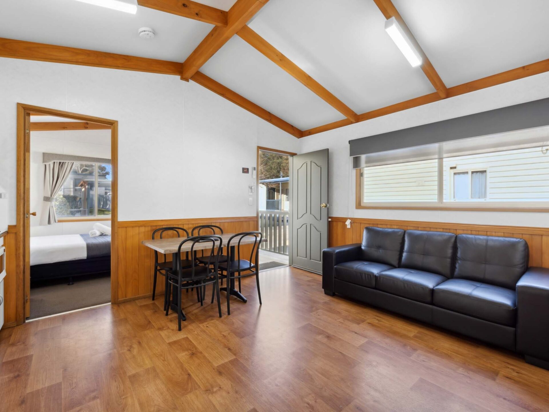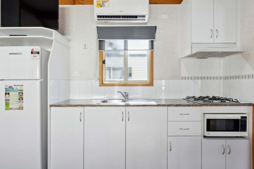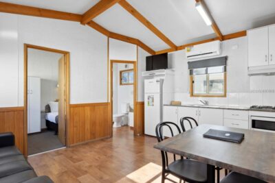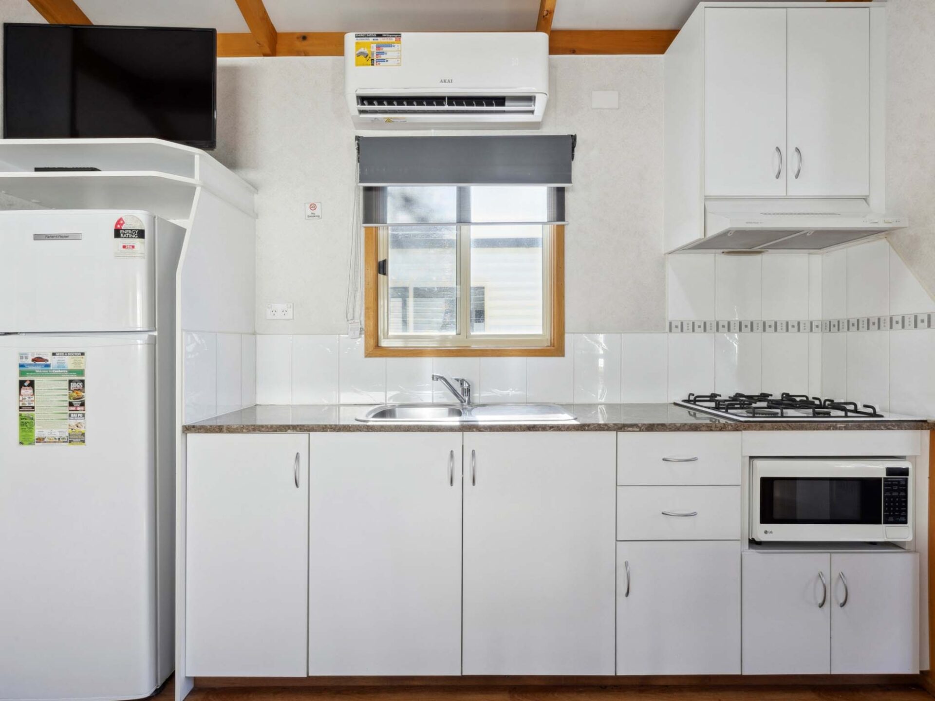 Unwind in this well-equipped two-bedroom cabin, ideal for up to four guests with a queen bed and two single beds. The full kitchen includes a gas stovetop, microwave, and full-size fridge, perfect for easy meals. Enjoy comfort with reverse cycle air conditioning and relax on your private balcony after a day of exploring.